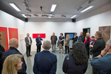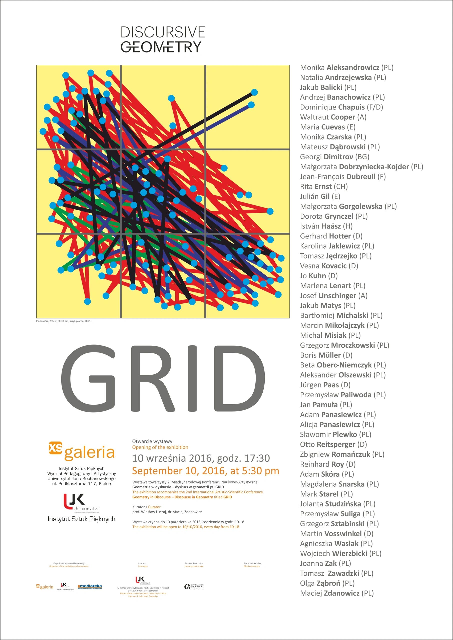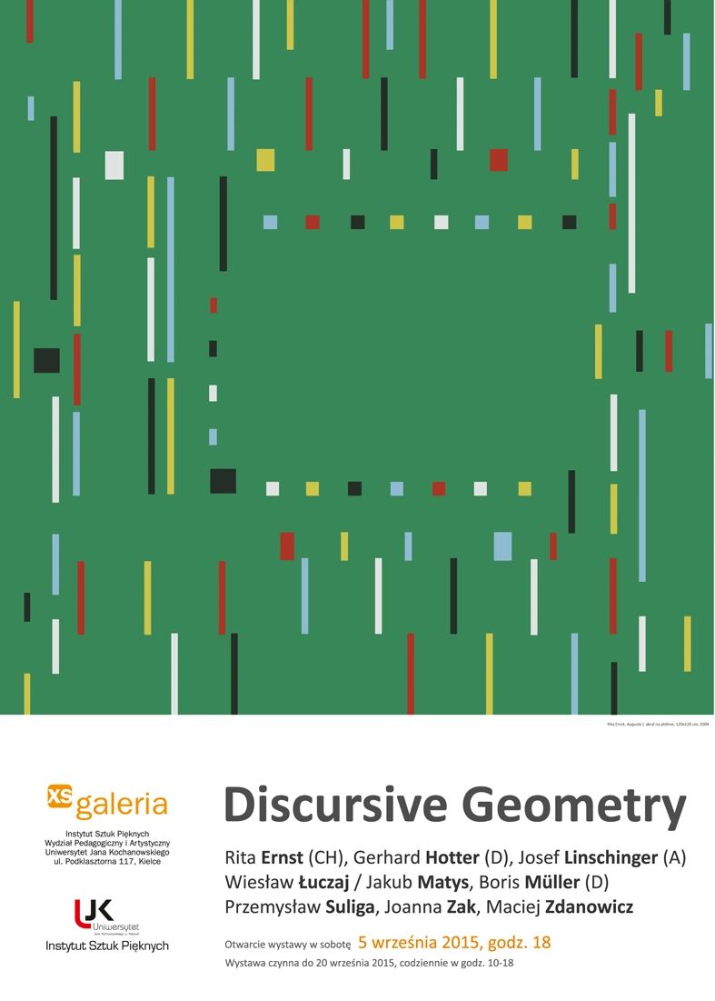 The international exhibition CONCRETE / DISCOURSE is a presentation of works by 34 artists from 7 European countries: Austria, France, Germany, Poland, Switzerland, Hungary and Italy. The presented creative attitudes are contained in two opposing currents of geometric art, namely Concrete Art and Discursive Geometry. Concrete Art should be free from any symbolic relationship with reality, because lines and colors are concrete things in themselves. Discursive Geometry illustrates various relationships with reality, such as social behavior of people, their participation in culture and art, our everyday life, etc. This purposefully assumed polarity of the exhibition shows the vitality of both trends, their evolution, exceeding the program limitations and contemporary play with the theoretical context in which works of art function.
