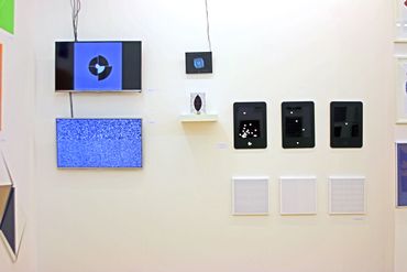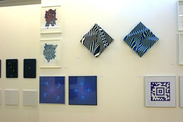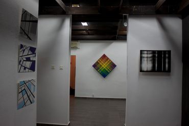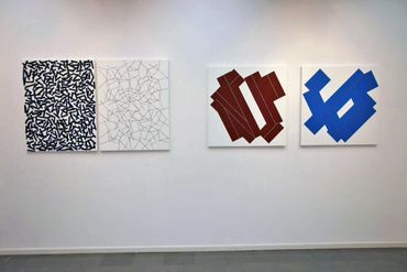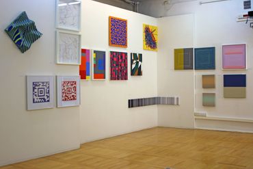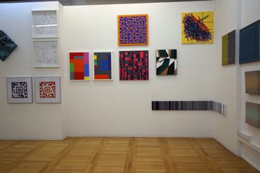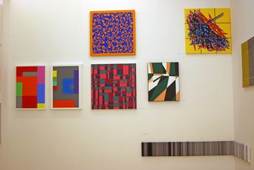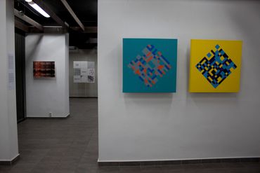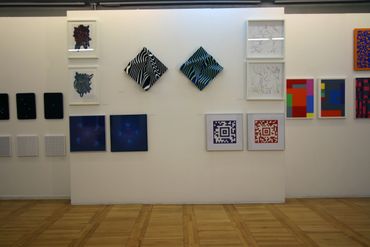 Gerhard Hotter (D) presents four paintings: PHLANGOC, CYLOVOGAR, BLUPAXIS and VELINDAR from a wide series of works inspired by the Langford mathematical system. The analysis of Langford's number logical system leads the artist to visual structures. Hotter transforms the system's zero-one notation to create a new, custom visual language. He believes that the image of the universe is contained in this transformed form of communication. The infinite and non-repetitive sequences of the Langford system allow the artist to have various configuration options, which may also include: musical pieces, landscapes, poems or parts of them.