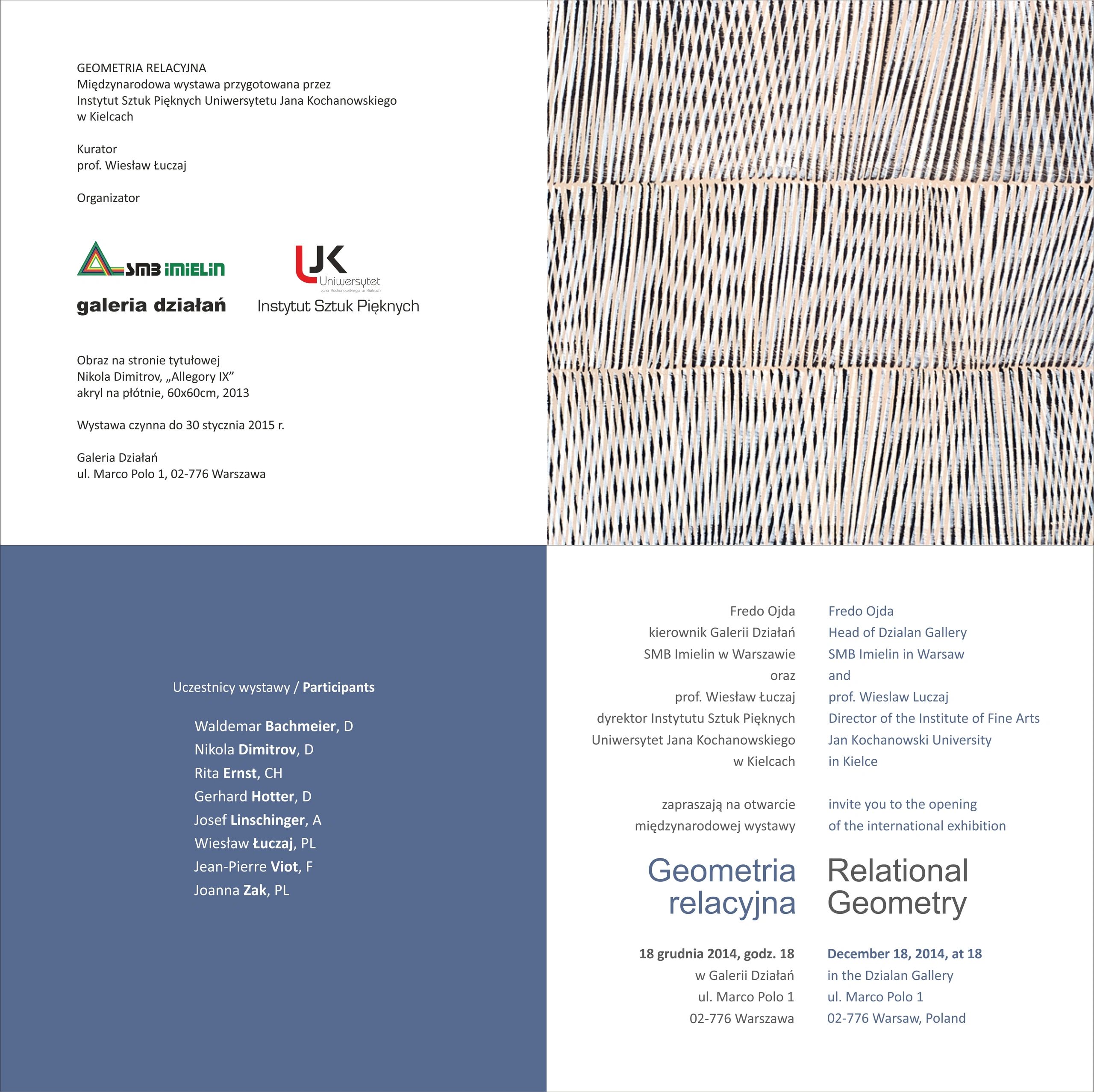 The international exhibition RELATIONAL GEOMETRY is a presentation of works by 9 artists from 5 European countries: Austria, France, Germany, Poland and Switzerland. The presented creative attitudes are contained in two opposite trends of geometric art, namely Concrete Art and Discursive Geometry, with the main emphasis being placed on discourses and relations.