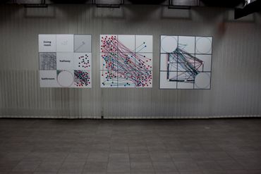 Joanna Zak (PL) presents paintings from the series "Joa's Activity", which refer to the author's everyday "bustle" around her own apartment. The paintings consist of 9 square modules, 8 of which represent the rooms of the apartment: living room, balcony, study, hall, child's room, bathroom, toilet and kitchen, and one module represents the outside world. The modularity of the works allows her to freely compose subsequent images. By swapping one or more modules with other images, a new image is created. The conversion always applies to the same room, e.g. a kitchen from one painting is replaced by a kitchen from another painting. The works show the author's activity on a specific date and time. Each time of the day is represented by a different color: red, green, blue and black. The lines in the pictures record the movement. A point means staying in a specific room.