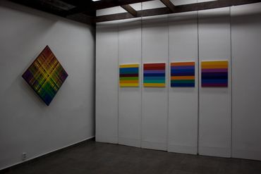 Waldemar Bachmeier (D) presents four paintings from a wide series of works inspired by Lotto draws. Bachmeier has created an original palette of 49 colors. Each of them was assigned numerical values from 1 to 49. Successive numbers are represented by colored stripes, arranged from top to bottom.