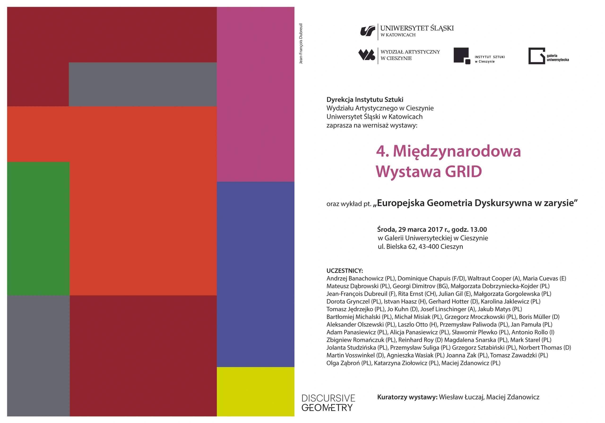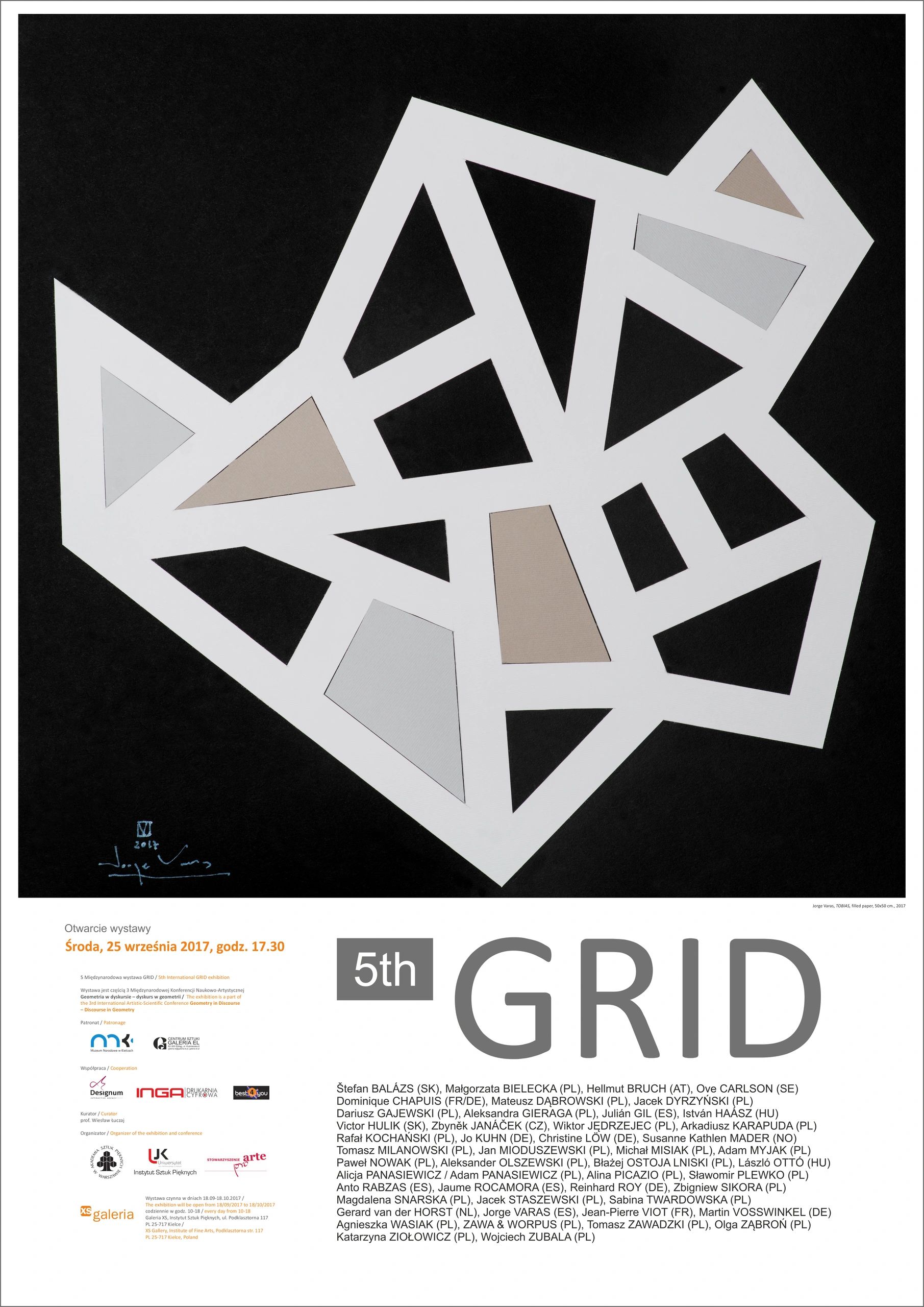 The 4th International GRID Exhibition is a presentation of works by 45 artists from 9 European countries: Austria, Bulgaria, France, Spain, Germany, Poland, Switzerland, Hungary and Italy. It is the next installment of a cyclical project in which the presented work is contained in two currents of geometric art - Concrete Art and Discursive Geometry. Previous editions took place at the XS Gallery of the Institute of Fine Arts, Jan Kochanowski University in Kielce (2014, 2015, 2016). In the last two years, the exhibitions were accompanied by the International Scientific and Artistic Conferences "Geometry in discourse - discourse in geometry", where the issue of the grid was considered in the context of visual arts, design arts and digital media.