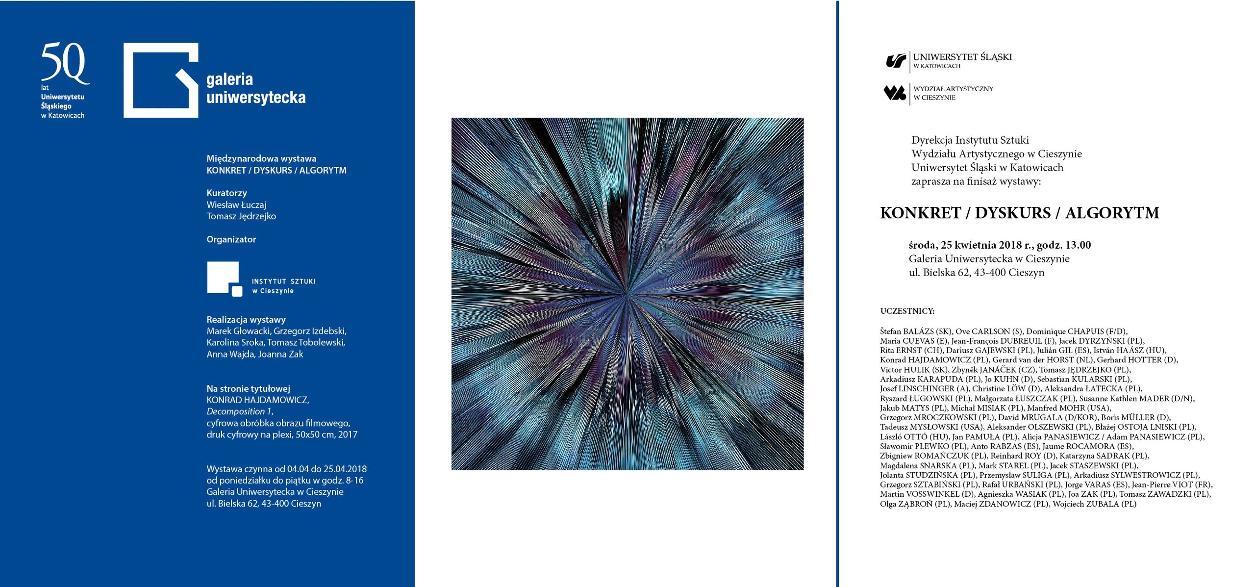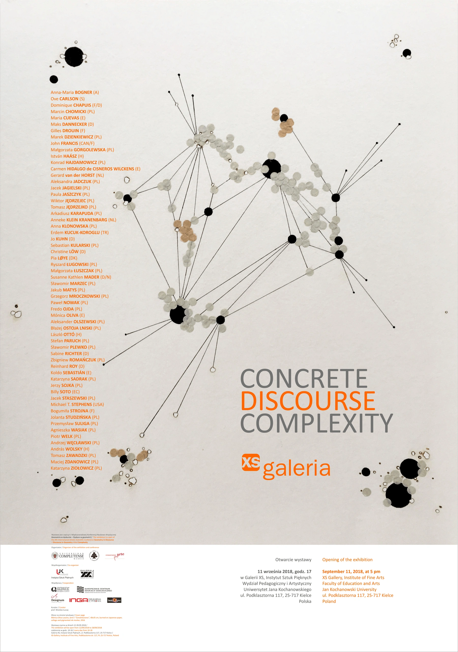 The international exhibition entitled CONCRETE / DISCOURSE / CODE is another part of a recurring project carried out by Prof. Wiesław Łuczaj from the Academy of Fine Arts in Warsaw, combining various trends in contemporary geometric art. These trends are hidden in the trinomial title: concrete art (CONCRETE), Discursive Geometry (DISCOURSE) and generative art (CODE).