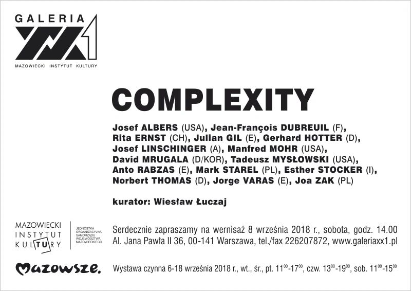 International exhibition entitled COMPLEXITY is the next installment of the project implemented by prof. Wiesław Łuczaj from the Academy of Fine Arts in Warsaw, combining various trends in contemporary geometric art. It is attended by 15 artists from the USA, South Korea and 7 European countries: Austria, France, Spain, Germany, Poland, Switzerland and Italy.